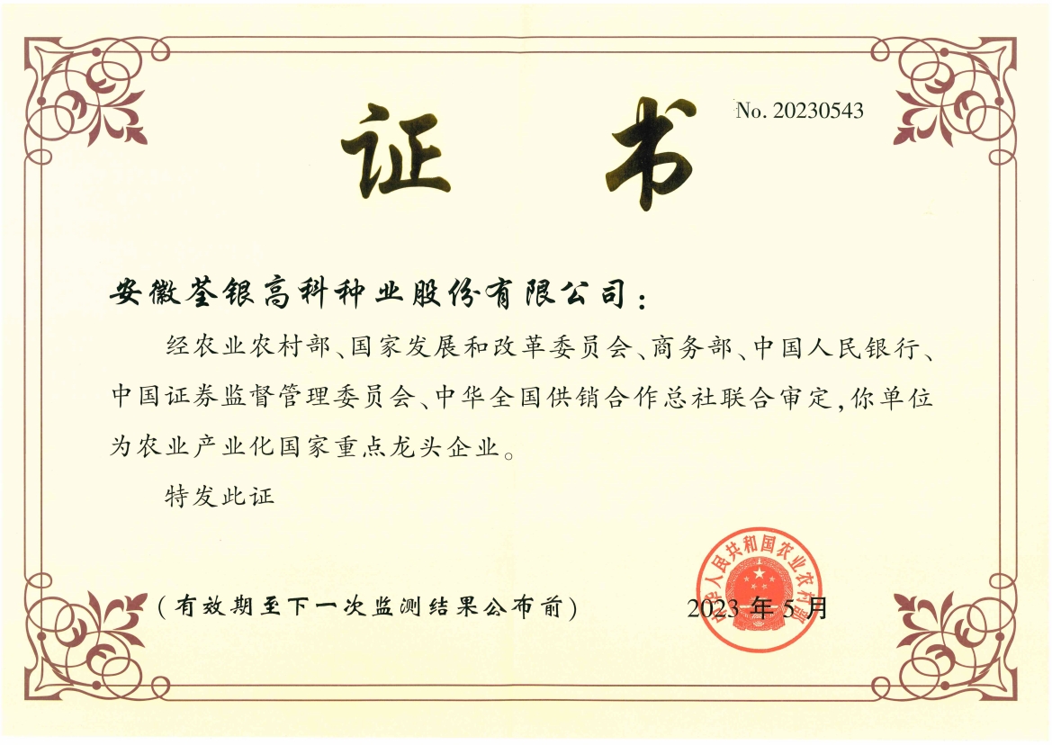 安徽荃銀高科種業(yè)股份有限公司是一家“以種業(yè)為核心、農(nóng)業(yè)服務(wù)為延伸、探索和創(chuàng)新農(nóng)業(yè)多元化發(fā)展”的現(xiàn)代高科技種業(yè)上市公司,證券代碼:300087。公司注冊資金9.47億元,系“中國種業(yè)領(lǐng)軍企業(yè)、農(nóng)業(yè)產(chǎn)業(yè)化國家重點龍頭企業(yè)、國家高新技術(shù)企業(yè)、農(nóng)業(yè)部首批農(nóng)作物種子育繁推一體化企業(yè)、中國種業(yè)信用明星企業(yè)"。在國內(nèi)控股子公司20多家,在國外設(shè)立分支機構(gòu)4家,良種銷售至全國20多個省(市、區(qū)),出口覆蓋20多個國家與地區(qū),種業(yè)綜合實力、雜交水稻研發(fā)、推廣及海外業(yè)務(wù)規(guī)模均居全國種子企業(yè)前2位。